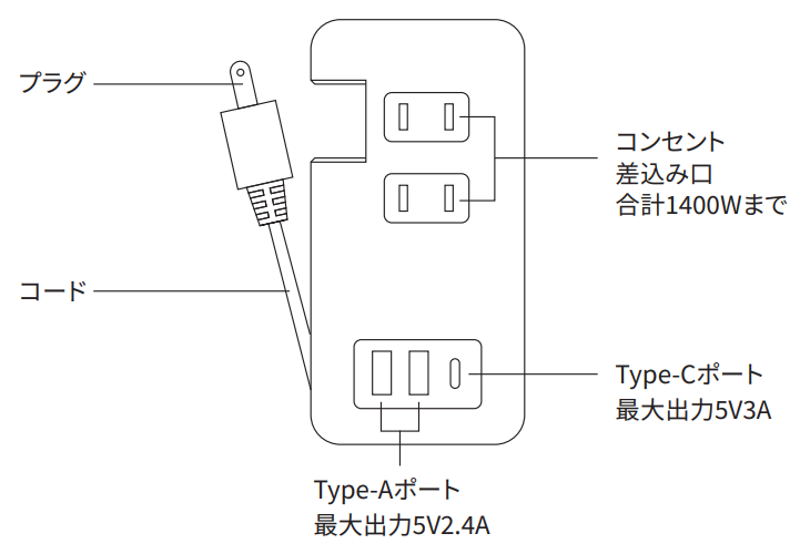 AC×2個口、Type-A×2ポート、Type-C×1ポート |