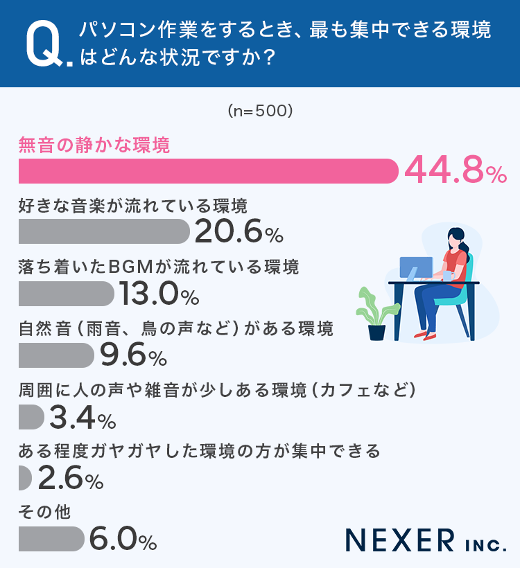 パソコン作業をするときにもっとも集中できる環境がどんな状況かを聞いた結果「無音の静かな環境」が最も多くなりました。