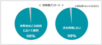 利用者アンケートでも 98%の方が「市町村のごみ回収に比べて便利」、98%が「次も利用したい」と回答し、満足度の高いサービスとして評価をいただいています。