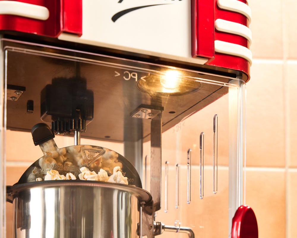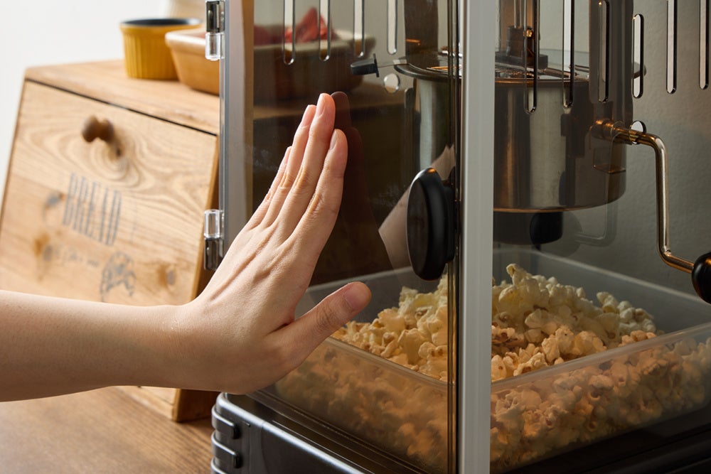 置くだけでお部屋のアクセントになるクラシックなデザインが魅力。調理の様子を楽しく演出するLED照明も搭載しており、まるでポップコーン屋さんのような雰囲気を楽しめます。