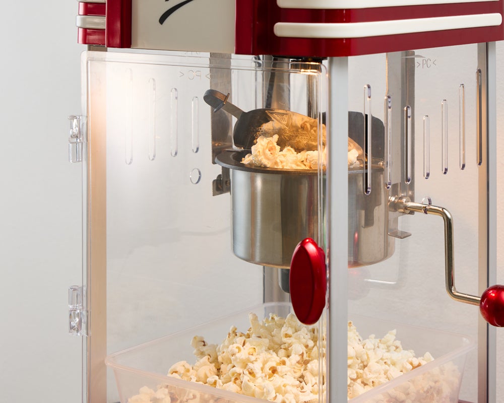 予熱後、ケトルにコーンと油を入れてスイッチをONにするだけのシンプル操作。約2〜4分でポップコーンが弾け始め、大人数が集まるパーティでも手軽に素早く提供できます。