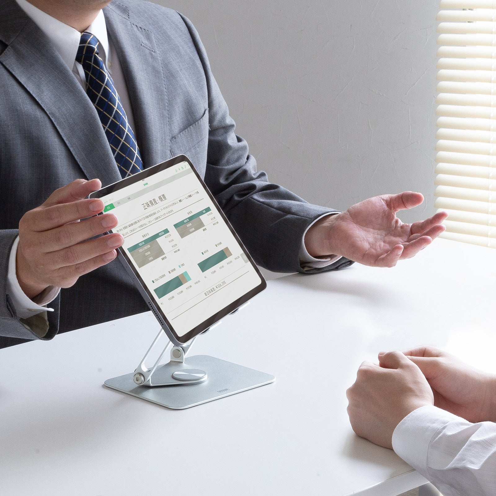 台座部分が360°回転するので、接客やプレゼン時の画面共有に最適です。