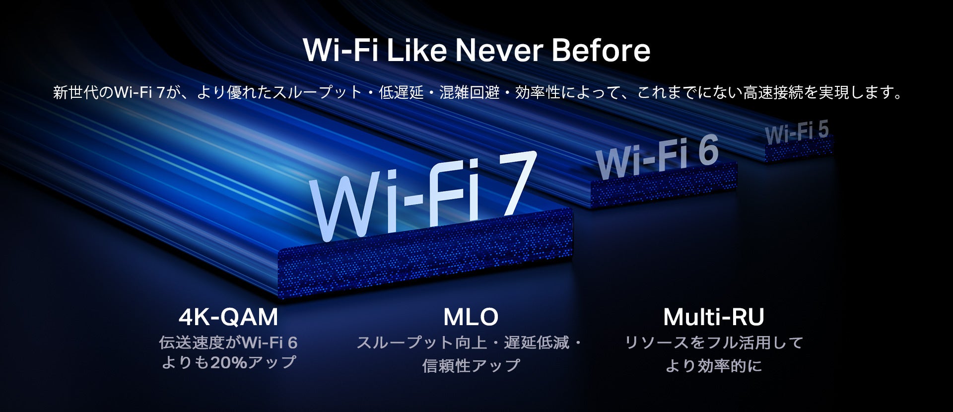 最新世代Wi-Fi 7テクノロジー対応*4:高速*5、低遅延*6な新時代のWi-Fi技術を採用