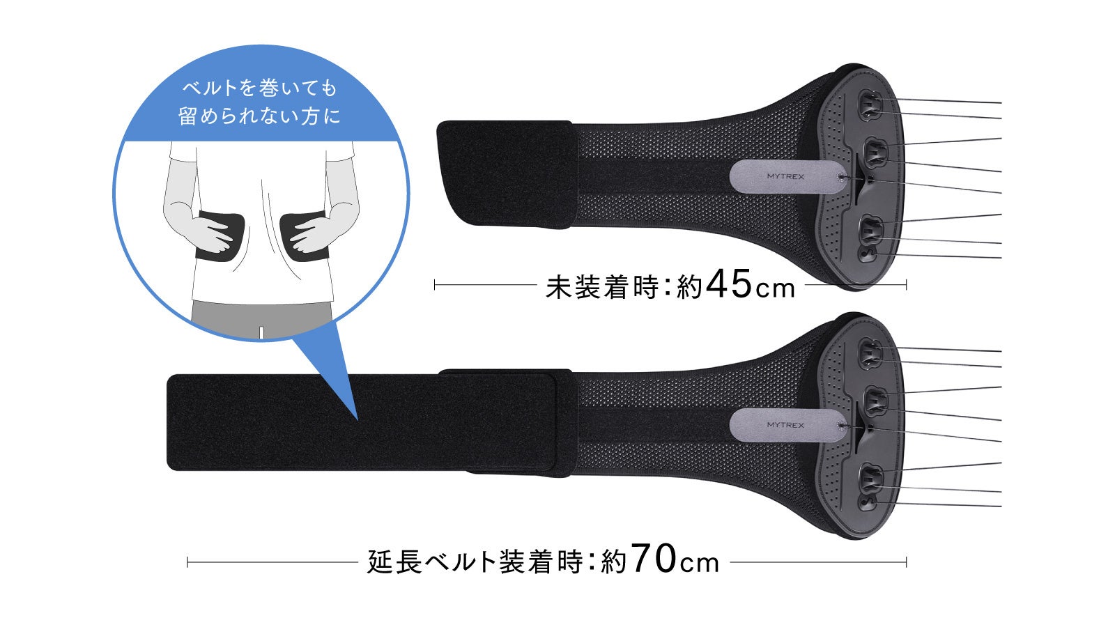 延長ベルト付きでウエスト60cm~130cmまで対応。幅広い体型の方にご使用いただけます。