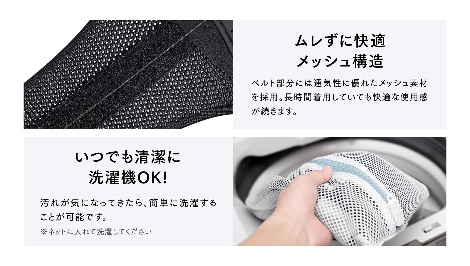 ベルト部分には通気性に優れたメッシュ素材を採用。汚れが気になってきたらネットに入れて洗濯することが可能で衛生面にも配慮してご使用いただけます。