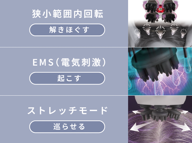 こわばった頭皮に「解きほぐす」「起こす」「巡らせる」ことにこだわり、ディープポイントモーションを採用。ドクターエアならではのもみとEMS、ストレッチを組み合わせて悩みの多い頭皮に働きかけます。