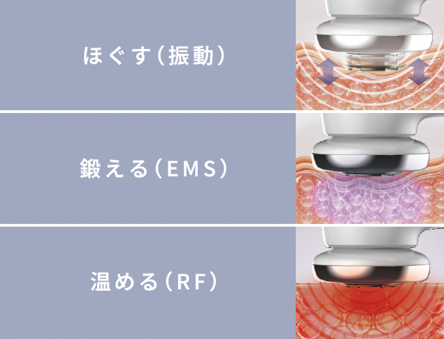 表情の動きにくさや重さが気になる現代人の顔のために、3つのフェイスモーションを搭載。「ほぐす(振動)」「鍛える(EMS)」「温める(RF)」という3つの刺激を同時に行うことで、筋肉、インナーコア、巡りの3層にアプローチ。最大約3,000回/分の振動で表情筋ケアをサポートします。