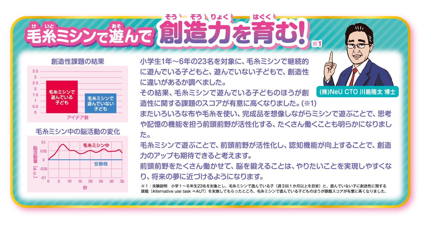 川島隆太博士に依頼し、株式会社Neuにて毛糸ミシンと創造性に関する実証試験を行ったところ、思考や記憶の機能を担う前頭前野が活性化し、かつ毛糸ミシンで遊んでいる子どものほうが創造性に関する課題のスコアが有意に高くなりました(※1)。毛糸ミシンで遊ぶことで、前頭前野が活性化し、認知機能が向上し、創造性の向上も期待できると考えます。
