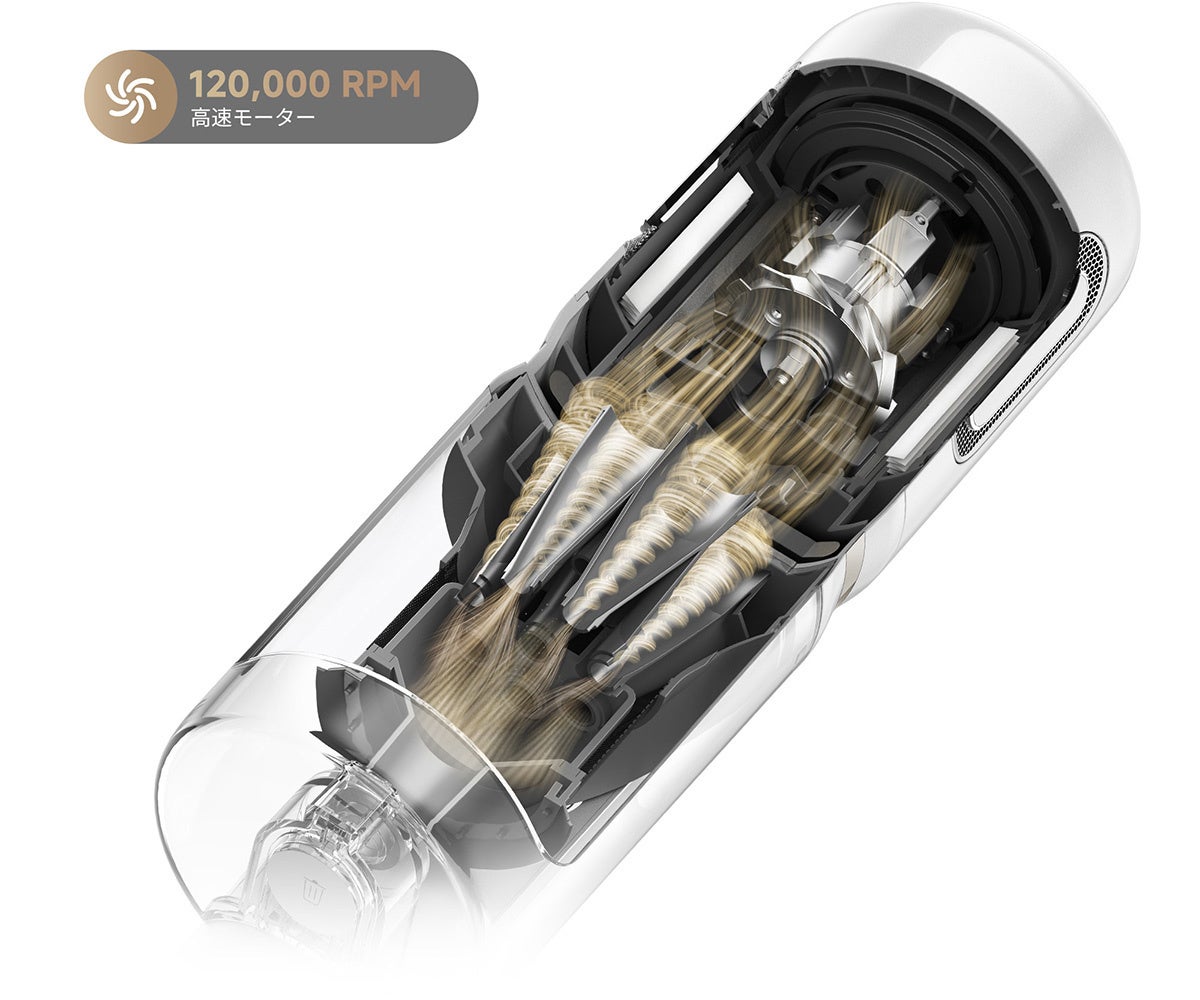 電動ミニブラシ(ダニ除去率99%)やソフトダスティングブラシ、延長ロッドなど、あらゆる空間に特化したアタッチメントを標準装備。車のダッシュボードや家具のすき間、棚の上までスッキリ清掃。