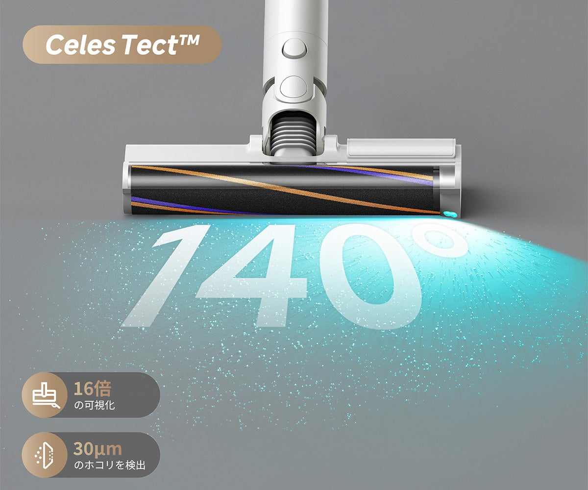 CelesTectイルミネーション機能により、暗い所のホコリも最大16倍可視化し、30μmレベルの微細な汚れまで発見可能。また、0mm Clean-to-Edge設計で壁際の隙間をピッタリ吸引、これまで届かなかった畳のヘリや家具の下まで完全クリーンに。