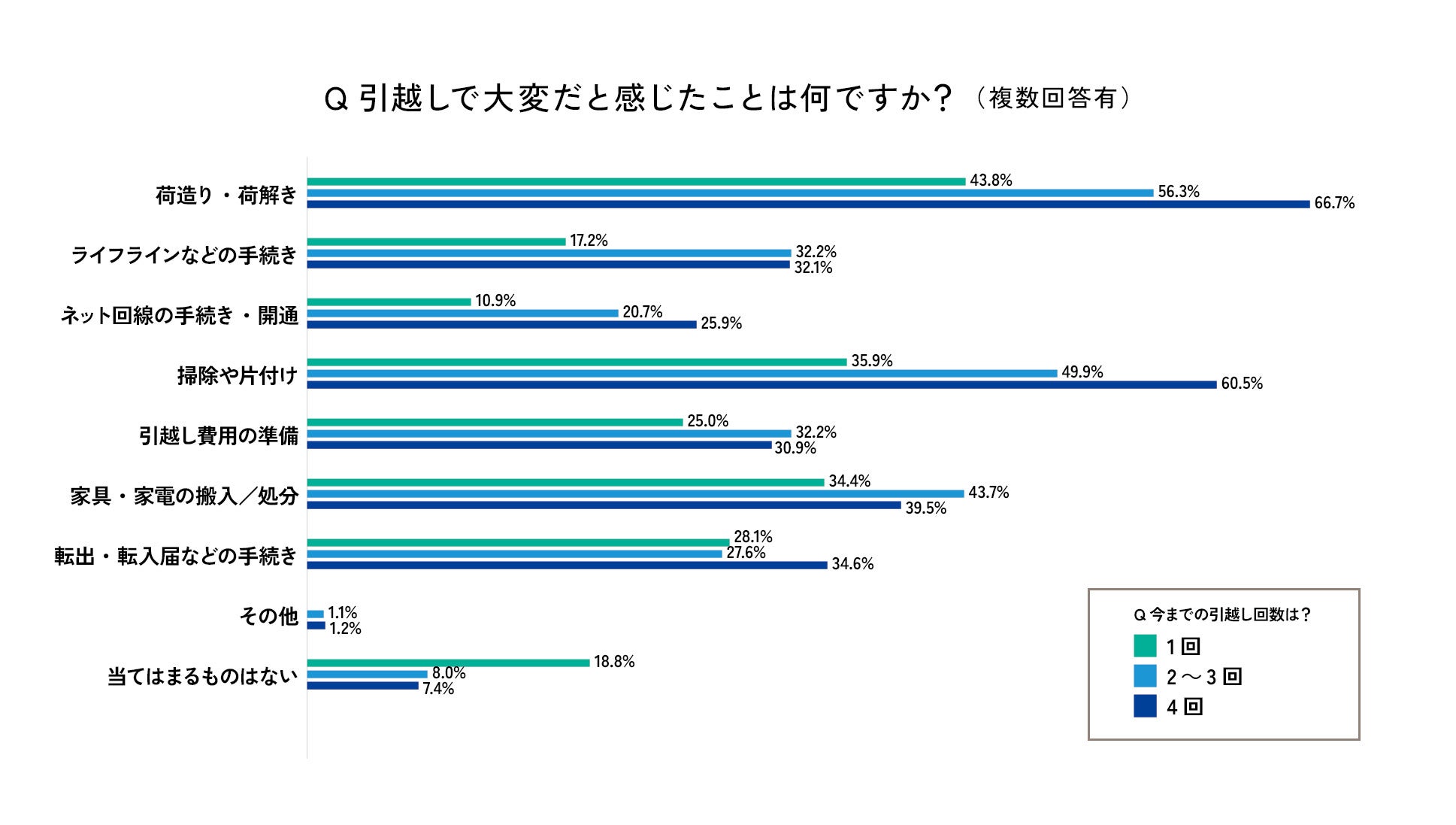 次いで「掃除や片付け」が挙がり、引越し回数が増えるにつれて大変さを感じる割合が上昇していました。(1回:35.9% → 4回以上:60.5%)荷物や生活年数が増えるほど整理や清掃の負担が大きくなる傾向があると考えられます。