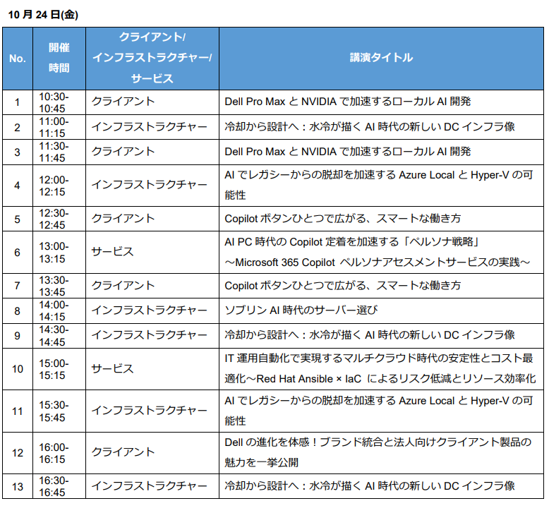 デル・テクノロジーズのブースでは、AI、エッジ、仮想化、ハイブリッドクラウド、水冷データセンター向け機器などITインフラの導入から、PCや周辺機器などIT資産の導入にかかわる担当者様まで、最新の動向やソリューションを一挙に展示・公開しています。クライアント関連では、小規模ビジネス向けに10月より販売が開始された手頃でビジネス フレンドリーなDell Pro Essentialシリーズから、クリエイターやAI開発者向けに設計され、ポータビリティーと卓越したパワーを実現するDell Pro Maxシリーズまで、多様なニーズに対応する幅広いラインナップのPCを展示します。また、デジタルアシスタントを展示し、来場者にブースをご案内します。 IT基盤関連では、生成AI時代をリードするサーバー基盤、水冷ラック ソリューション、Azure Localソリューションなどをご紹介します。