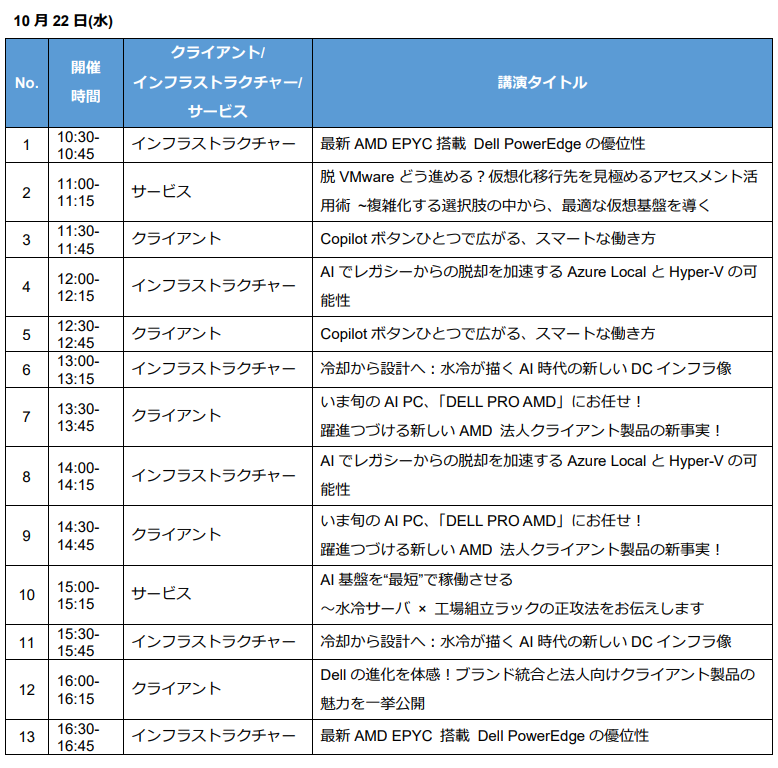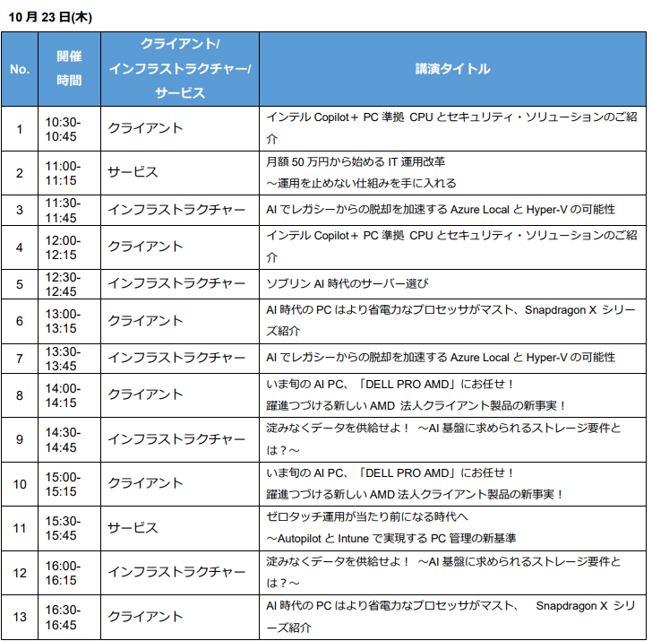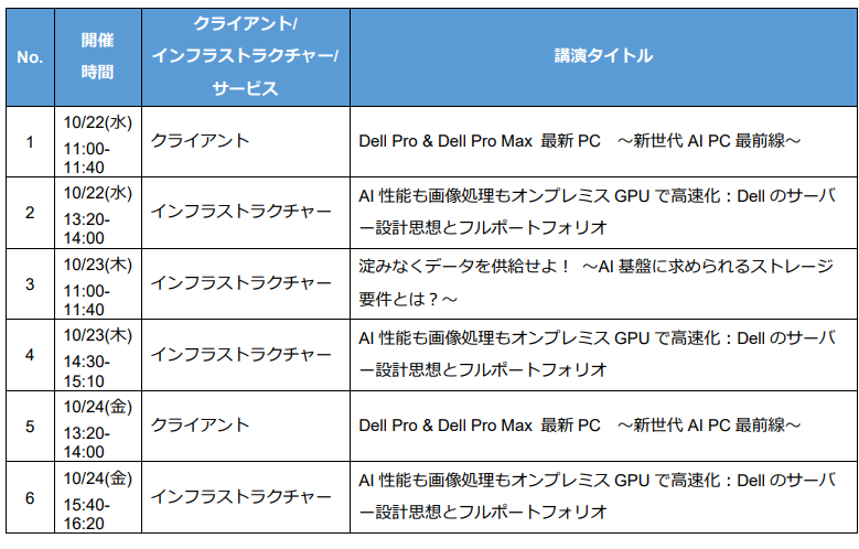 さらに、30分ごとに開催するブース講演では、PCブランド刷新の概要やクライアント新製品の特長、AI基盤の根底を支えるストレージ基盤の重要性、AI時代の新たなDCインフラ像など、様々なテーマについて各担当者よりご説明します。
