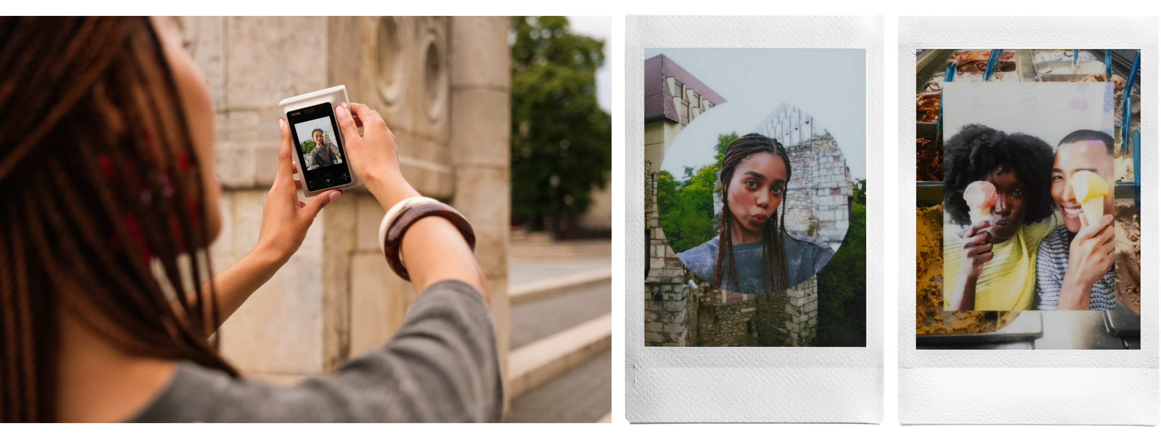 instax™シリーズで初めてセルフィーカメラを搭載し、カメラ背面のモニターでプリントイメージを確認しながら、友達や家族と簡単に自撮りが可能。セルフィーカメラには広角レンズを採用し、大人数でも一緒に撮影できます。セルフィーカメラとメインカメラの2つのレンズを使用した撮影モード「Layered Photo Mode」では、セルフィーカメラで撮影した自撮りをメインカメラで撮影した風景画像に重ねてプリント可能。自撮りした表情とその場の風景を合わせることで、撮影した瞬間の感情や情景を鮮明に蘇らせる、思い出の詰まったチェキプリント™に仕上げます。