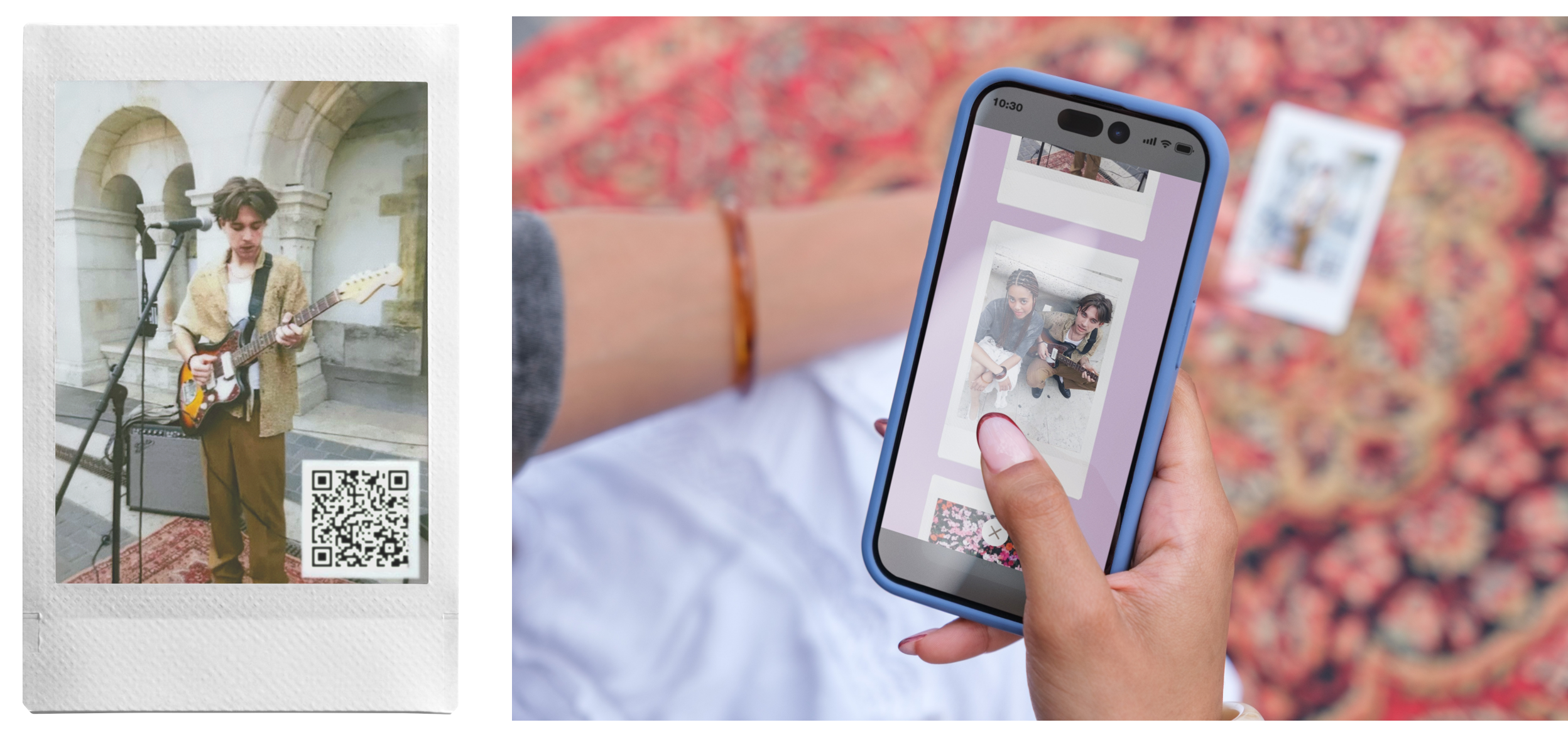 最大10枚の音付き画像から、背景やテーマに合うBGMを付けた最大30秒のスライドショー形式の動画を作成できます。作成した動画はQRコード化し、表紙に選んだ画像と一緒にプリント可能。QRコードはスマホのQRコードリーダーで読み取ることで、動画を再生・ダウンロードできます(※2)。一緒に過ごした思い出をいつでも見返せるチェキプリント™にして渡せば、贈る相手との繋がりが深まります。