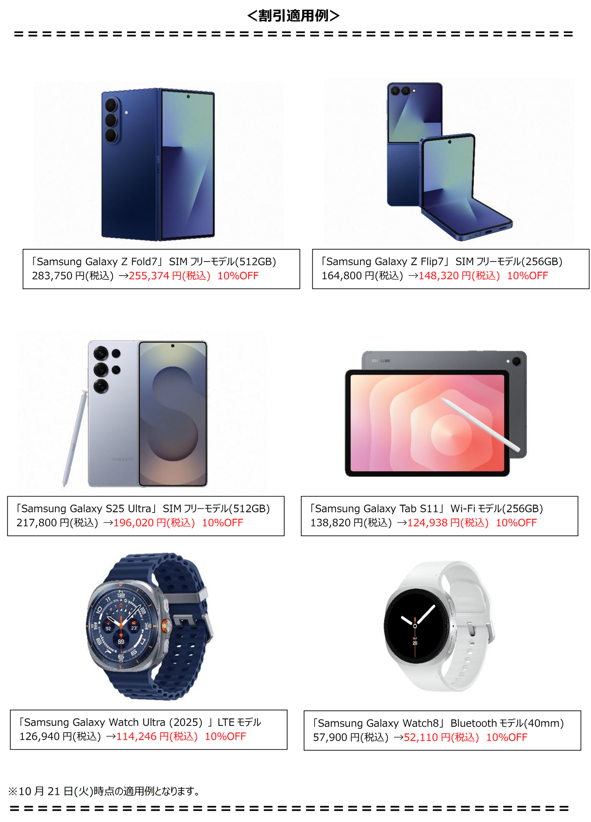 期間中にSamsungオンラインショップ(https://www.samsung.com/jp/offer/)、Galaxy Harajuku、Galaxy Studio Osakaで下記対象製品を10%オフの価格でご購入いただけます。