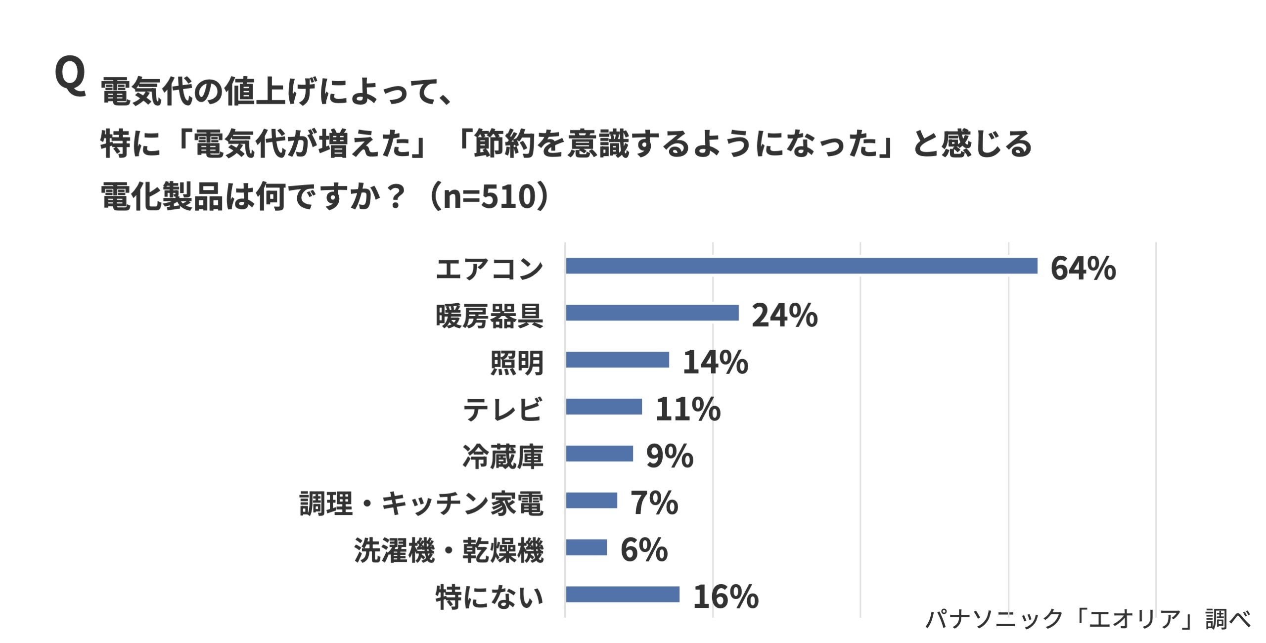 最後に、「電気代の値上げによって特に“電気代が増えた”“節電を意識するようになった”と感じる電化製品」を聞いたところ、「エアコン」(64%)が圧倒的1位に。暖房シーズンを前に、多くの家庭で“冬のエアコン節電”が最大のテーマとなっていることがわかります。
