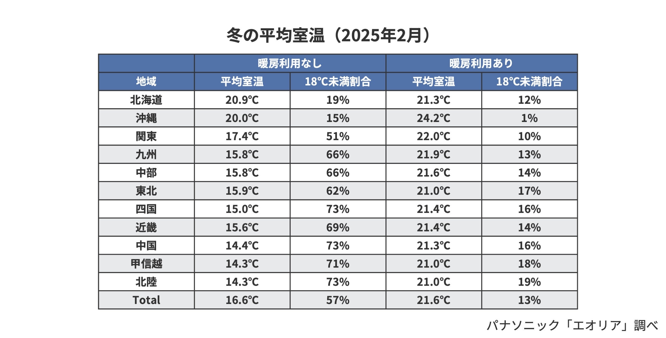 エオリアユーザーデータ(2025年2月)によると、エアコンを使用していない場合、全国平均の室温は16.6℃にとどまり、18℃未満となる世帯割合は57%に達していました。これに対し、暖房を利用した場合は全国平均室温が21.6℃まで上昇します。