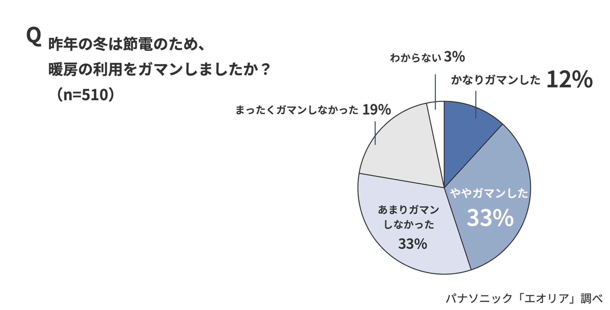 節電意識の高まりから懸念されるのが暖房控えです。昨冬の暖房利用については、「かなりガマンした」12%、「ややガマンした」33%と、約半数が節電のために暖房利用を控えていたことがわかりました。
