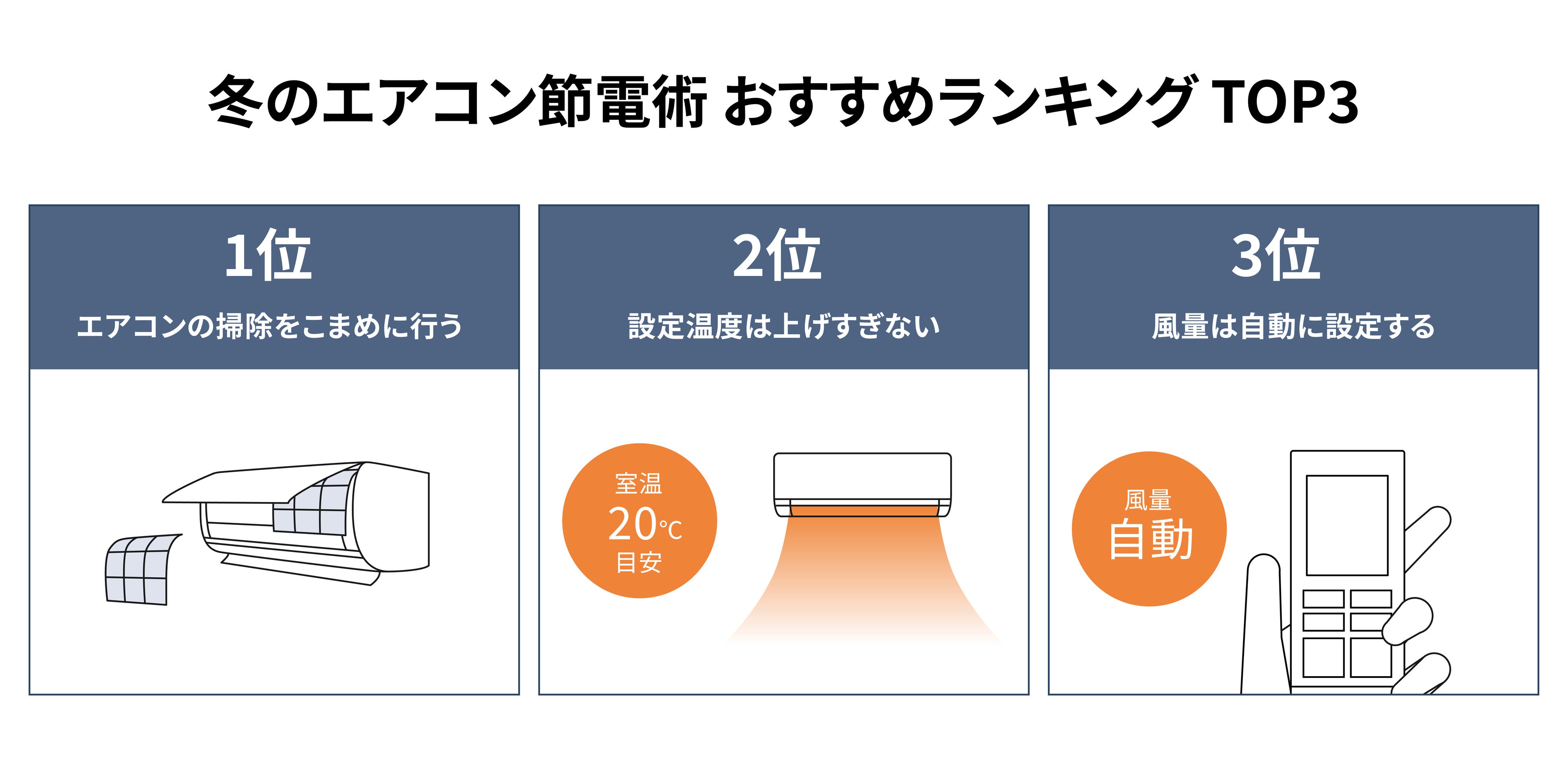特に、「エアコンの掃除をこまめに行う」(1位)、「設定温度は上げすぎない」(2位)、「風量は自動に設定する」(3位)は、節電効果が高いため、意識して実践してみましょう。
