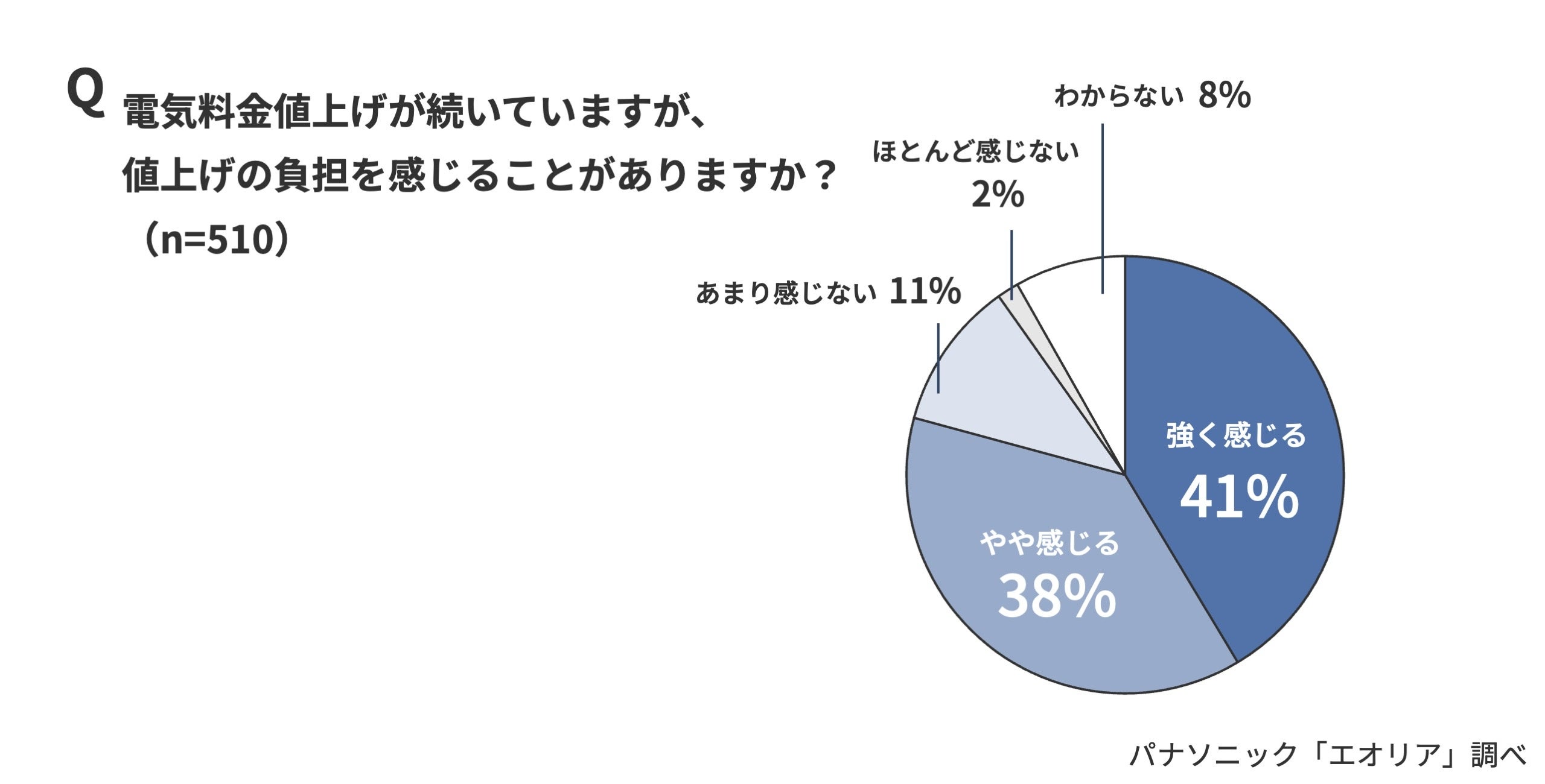 続いて「電気料金値上げの負担を感じることがありますか?」という質問でも、「強く感じる」41%、「やや感じる」38%と、79%が負担を実感していることがわかりました。