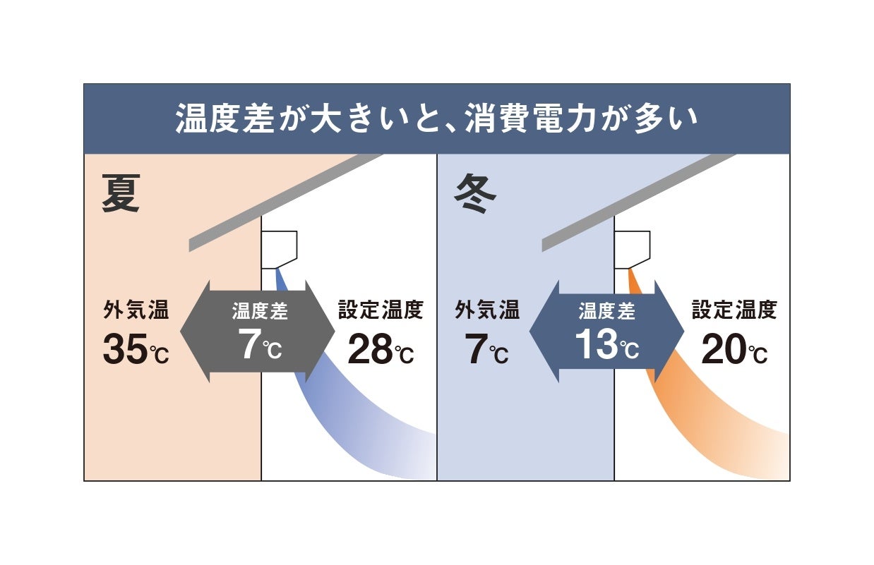 温度差が同じ場合でも、冷やすよりも暖めるほうが電力を消費するため、暖房運転のほうが消費電力が多くなり、電気代が高くなります。
