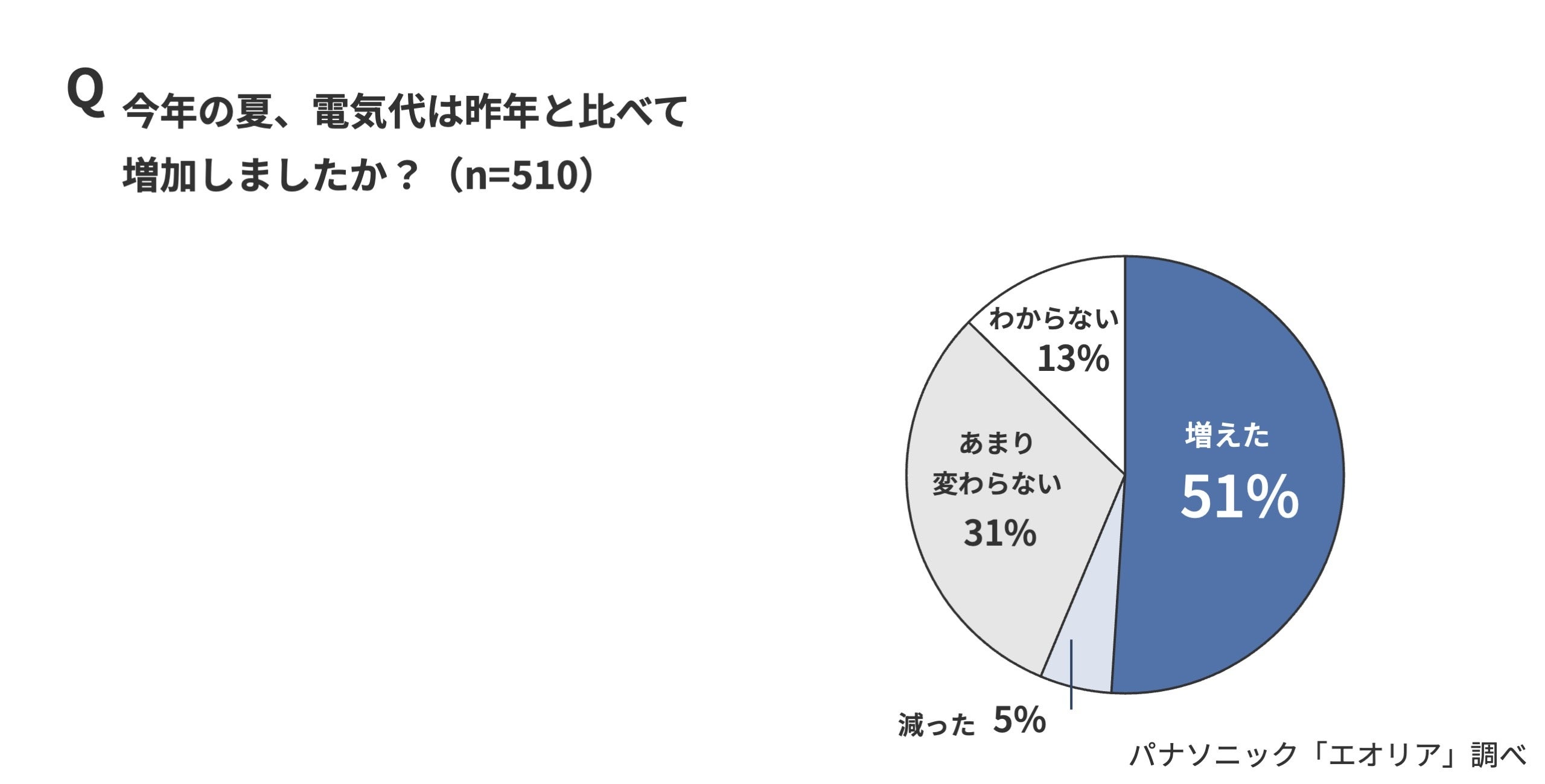 冷房利用が長引いていた今シーズンの背景を受け、まず「今年の夏、電気代は昨年と比べて増加しましたか?」とたずねたところ、「増えた」と回答した人が51%と過半数を占めました。