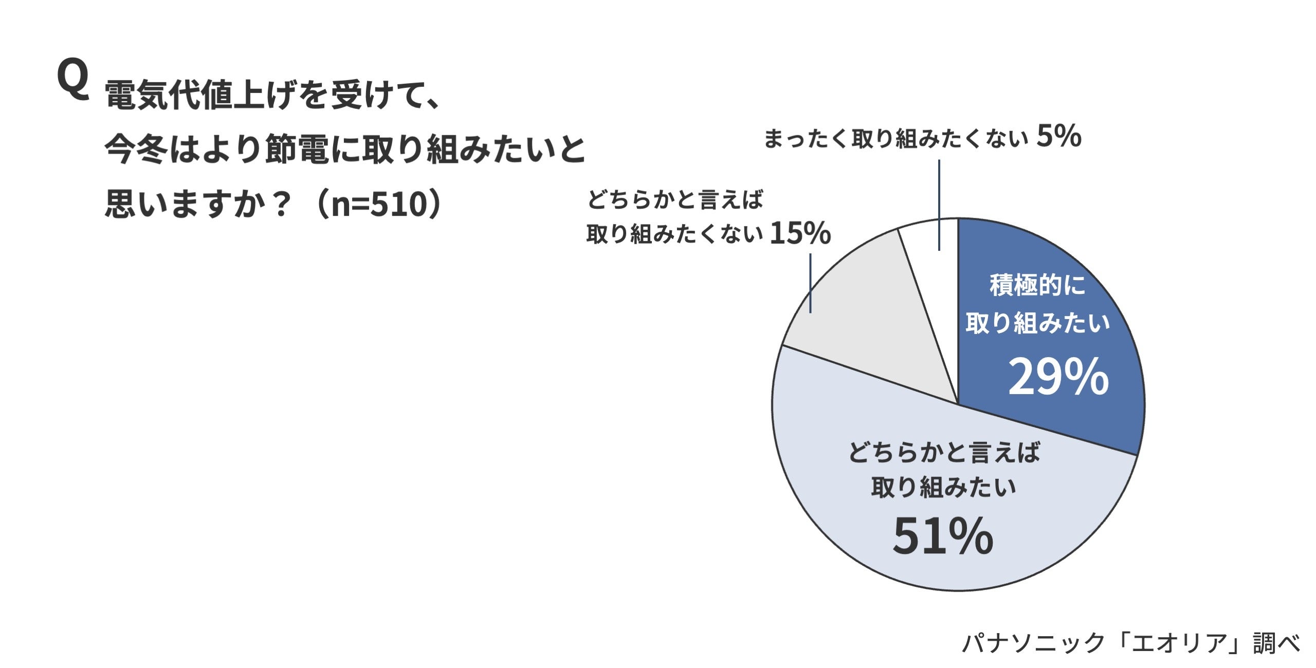 このような中で、「今冬はより節電に取り組みたいと思いますか?」とたずねたところ、「積極的に取り組みたい」29%、「どちらかといえば取り組みたい」51%と、80%が“節電意欲あり”と回答しました。電気代高騰を背景に、冬の節電意識が高まっている様子がうかがえます。