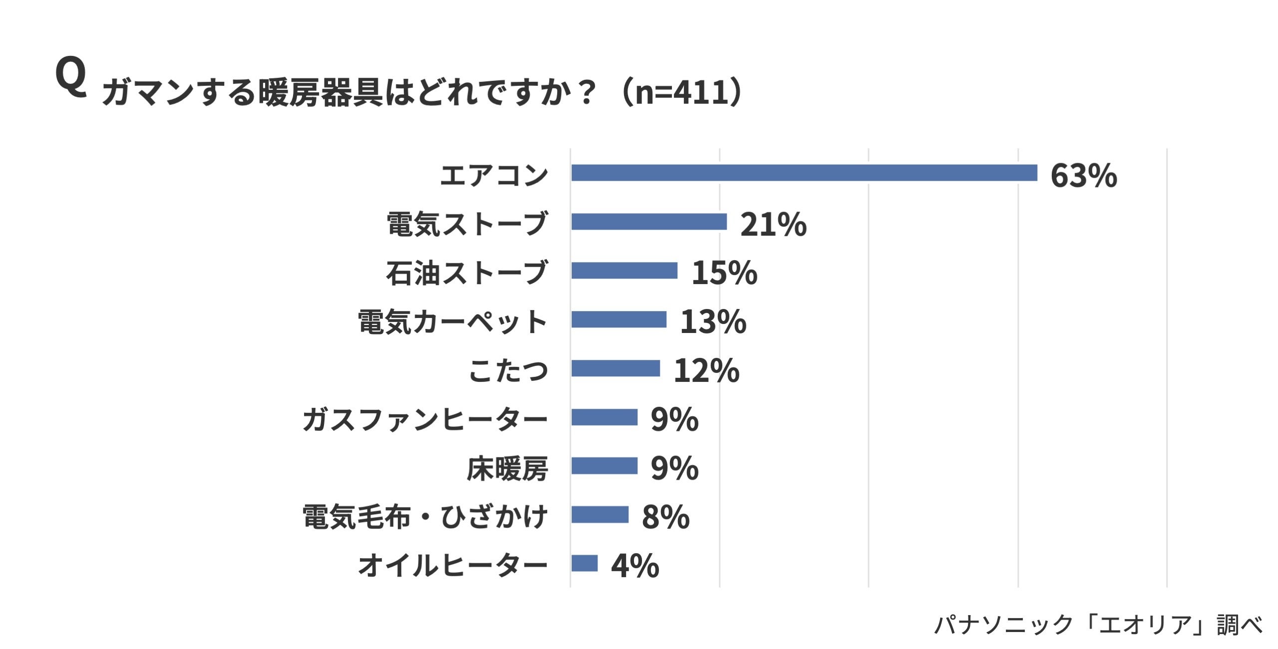 実際に「ガマンする暖房器具」をたずねると、最も多かったのは「エアコン」(63%)で、2位の「電気ストーブ」(21%)を大きく上回りました。