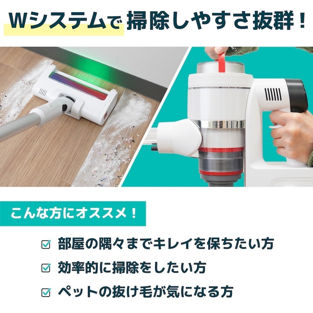 本製品は、特殊形状のWローラーで壁際のゴミまでしっかり吸い込む、サイクロン式掃除機です。