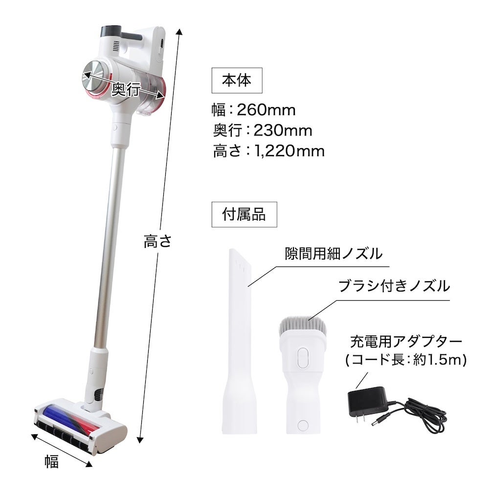 ・セット内容/本体、延長管、床用ノズル、ブラシ付きノズル、隙間用細ノズル、専用バッテリー、ACアダプター、日本語取扱説明書