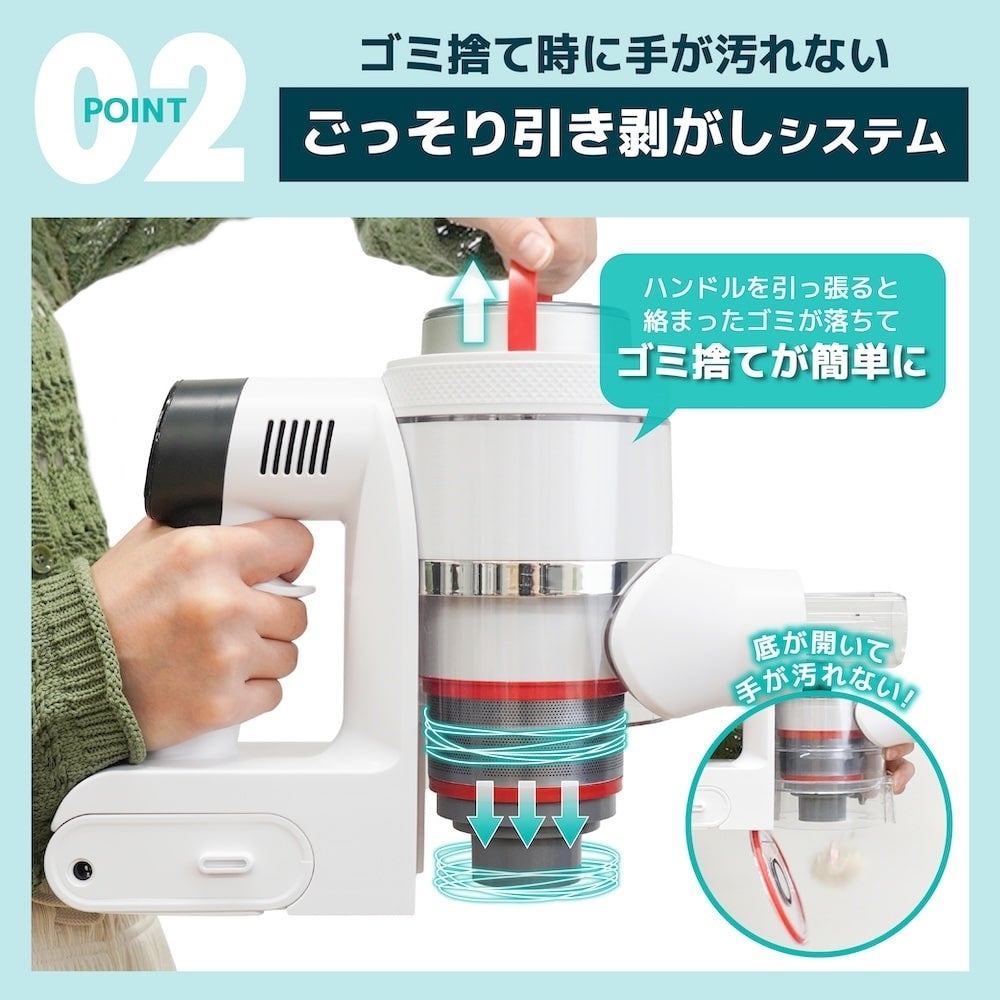 吸い取って絡まったゴミを手で触れずにはがせる「ごっそり引き剥がしシステム」は、ハンドルを引っ張ると絡まったゴミをこそぎ落とし、底の蓋を開くことでゴミに触れずにダストタンクを綺麗にできるシステムです。