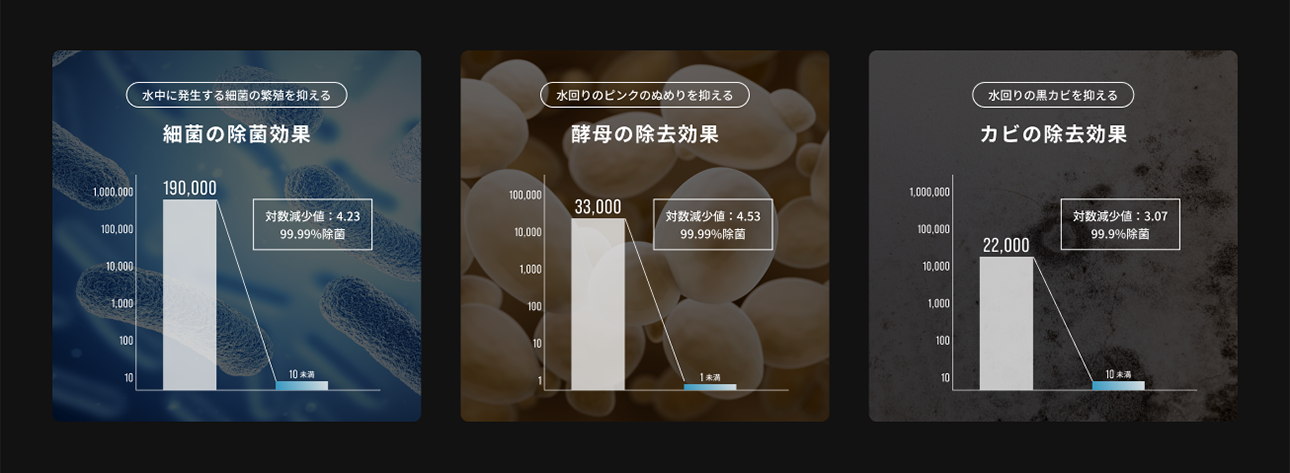 ・自社試験の結果であり、ご使用環境により汚れやぬめりなどが付着している場合はお手入れが必要です。