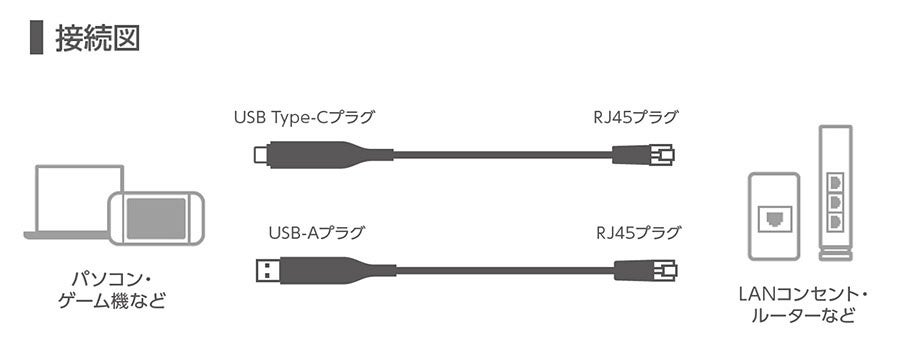 対応機器:USBプラグ側:USB-A(LD-AL1Gシリーズ)またはUSB Type-C(LD-CL1Gシリーズ)ポート搭載のパソコン・ゲーム機(Nintendo Switch(TM)、Nintendo Switch(TM) 2など※1)、RJ45プラグ側:RJ45ポート搭載のLANコンセント・ルーターなど