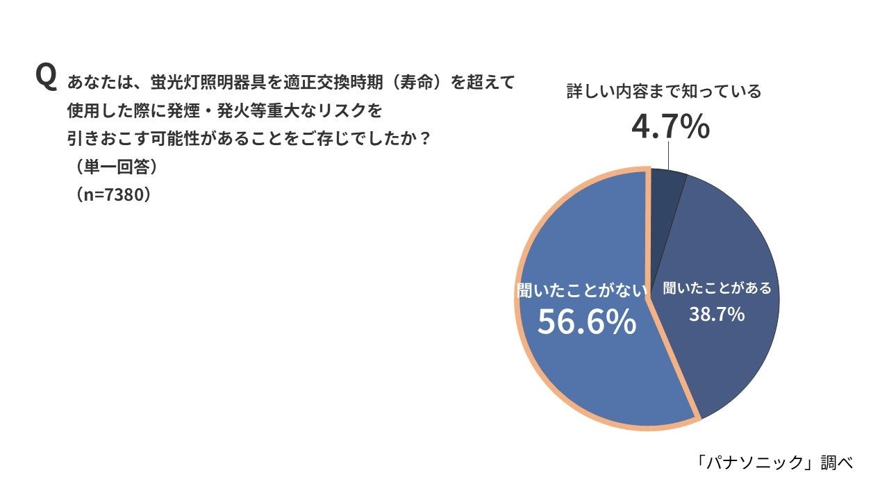 そして蛍光灯照明器具を適正交換時期(寿命)を超えて使用した際に発煙・発火等の重大リスクを引き起こす可能性があることについて知っているか聞いたところ、詳しく知っている人はわずか4.7%で、「聞いたことがない/初めて知った」と回答した方は前回の59.5%から微減したものの、未だ56.6%と半数以上の方が発煙・発火のリスクが存在することを知らないという結果になりました。