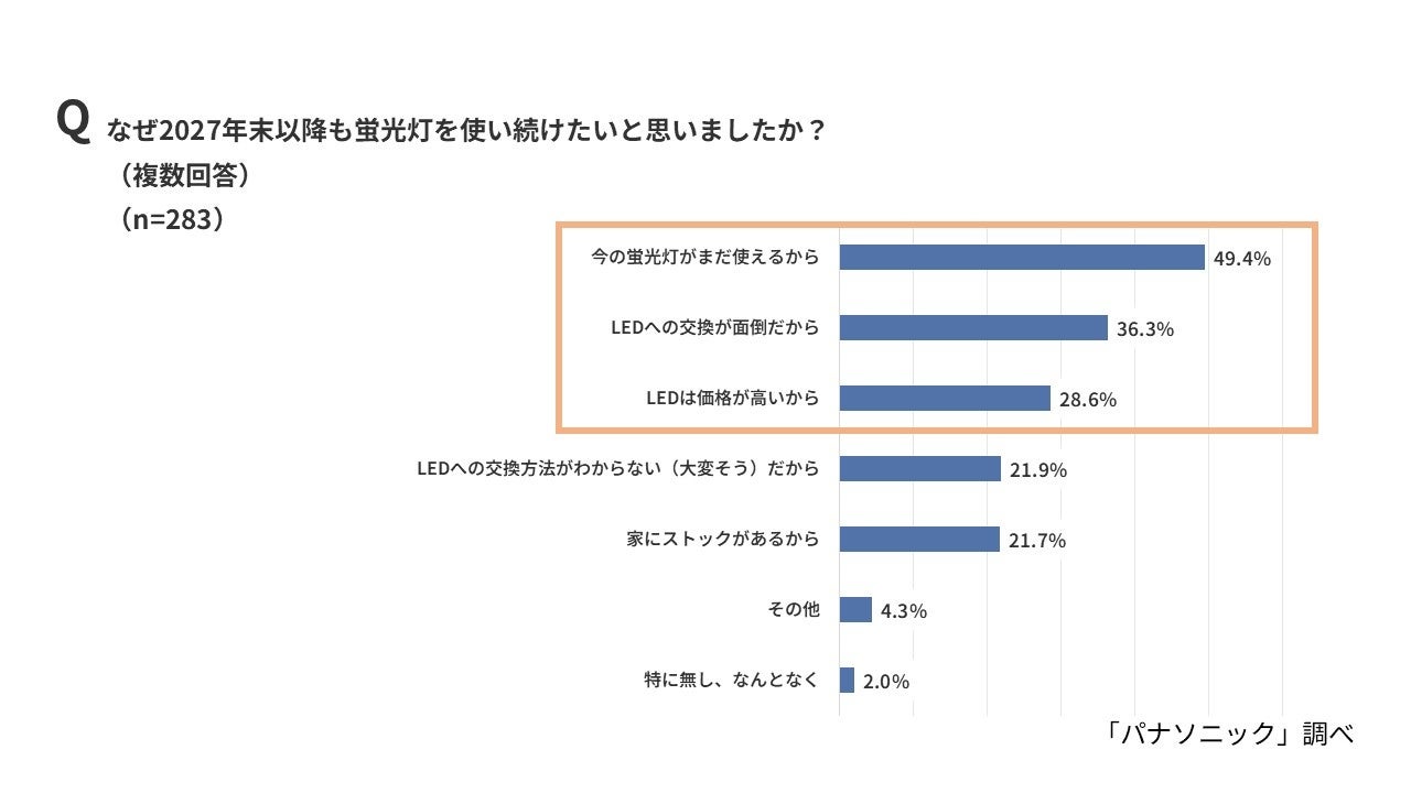 また、「2027年末の製造・輸出入禁止までに蛍光灯を買いだめして蛍光灯を使い続けたい」と回答した方は9.7%と一定数いることがわかります。蛍光灯を使い続けたい理由を聞くと、「今の蛍光灯がまだ使えるから」が最多で約半数の49.4%となり、「交換が面倒」が36.3%、「価格が高い」が28.6%となりました。心理的・経済的要因によってLEDへの切り替え意向が抑制されていることが浮き彫りとなりました。