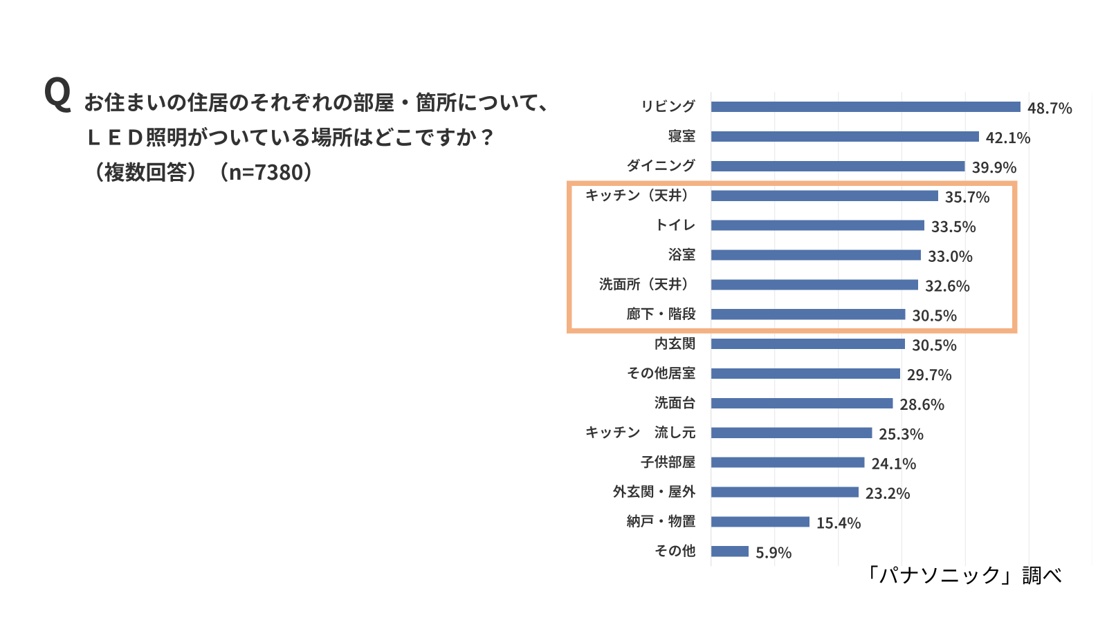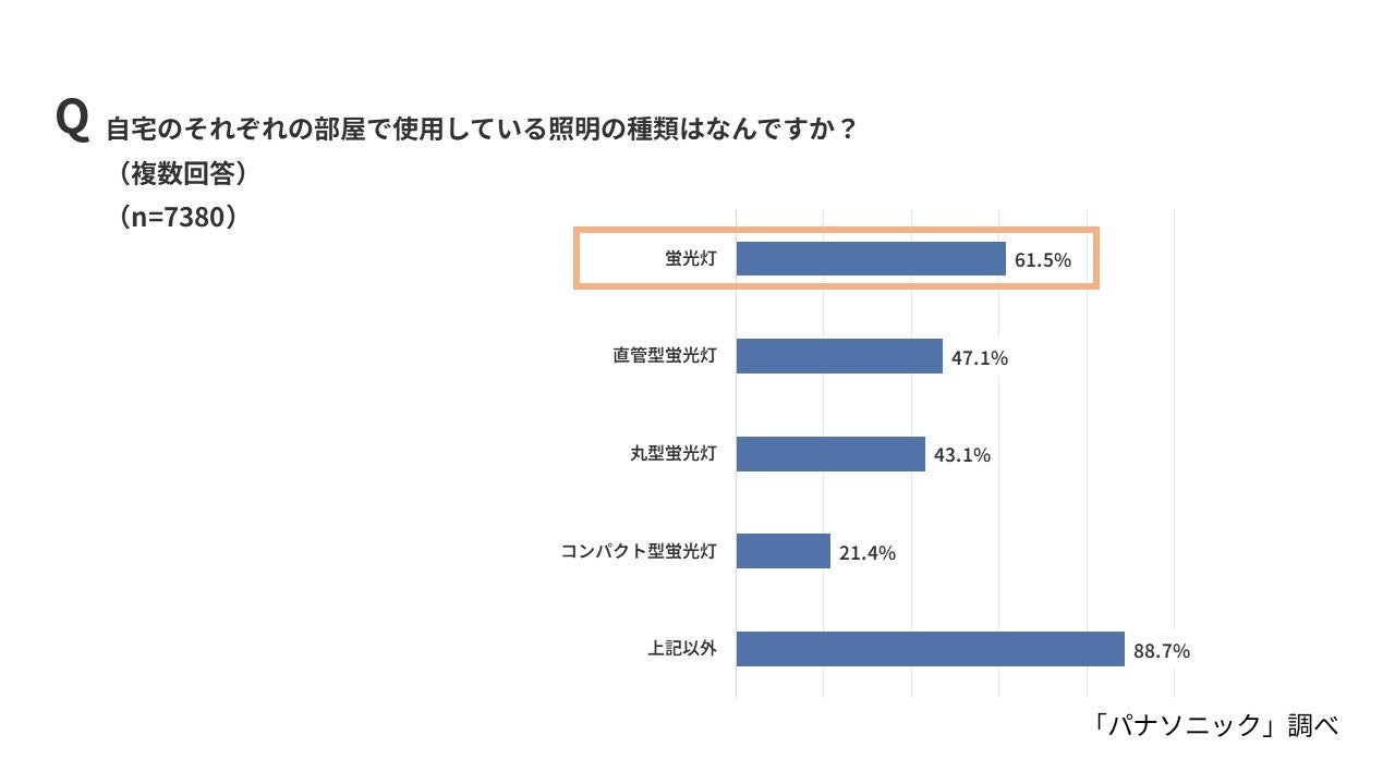 ・直管型・丸形・ツイン蛍光灯いずれかを使っている家庭が61.5%。家族が集まるリビングでもLED照明に切り替えている方は、まだ約半数。水回りや、廊下・階段などの動線部ではさらにLED化が進んでいないことが明らかに。