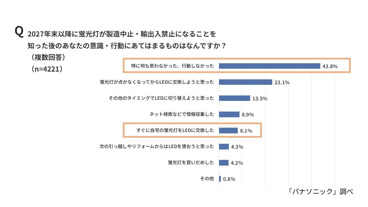 蛍光灯が製造中止・輸出入禁止になることを知った後、「すぐにLEDに交換した」のは前回より微増したもののわずか8.1%。43.8%が「特に何も思わなかった、行動しなかった」と回答。
