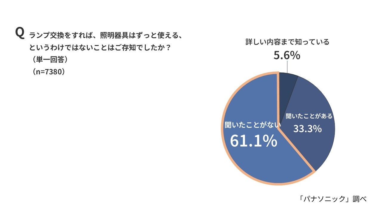 また、ランプ交換をすれば照明器具はずっと使えるというわけではない(ランプ以外の照明器具の部品も使用年数に伴い劣化する)ことを知っているかを聞いたところ、「知らなかった」が61.1%となり、多くの方がただランプを変えるだけで照明器具をずっと使い続けられると勘違いをしていることがわかりました。