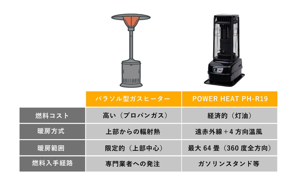 燃料コストやカートリッジ交換など、運用面で一定の手間がかかるパラソル型ガスヒーターに対し、『POWER HEAT PH-R19』は石油燃焼式ならではの高い熱効率を活かし、効率的に空間をあたためることができます。