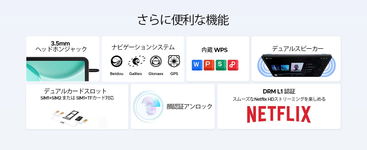 GPS/GLONASS/Beidou/Galileo対応でナビゲーションも強力。SIMフリータブレット、ナビ対応タブレットとしても注目度の高いモデルです。