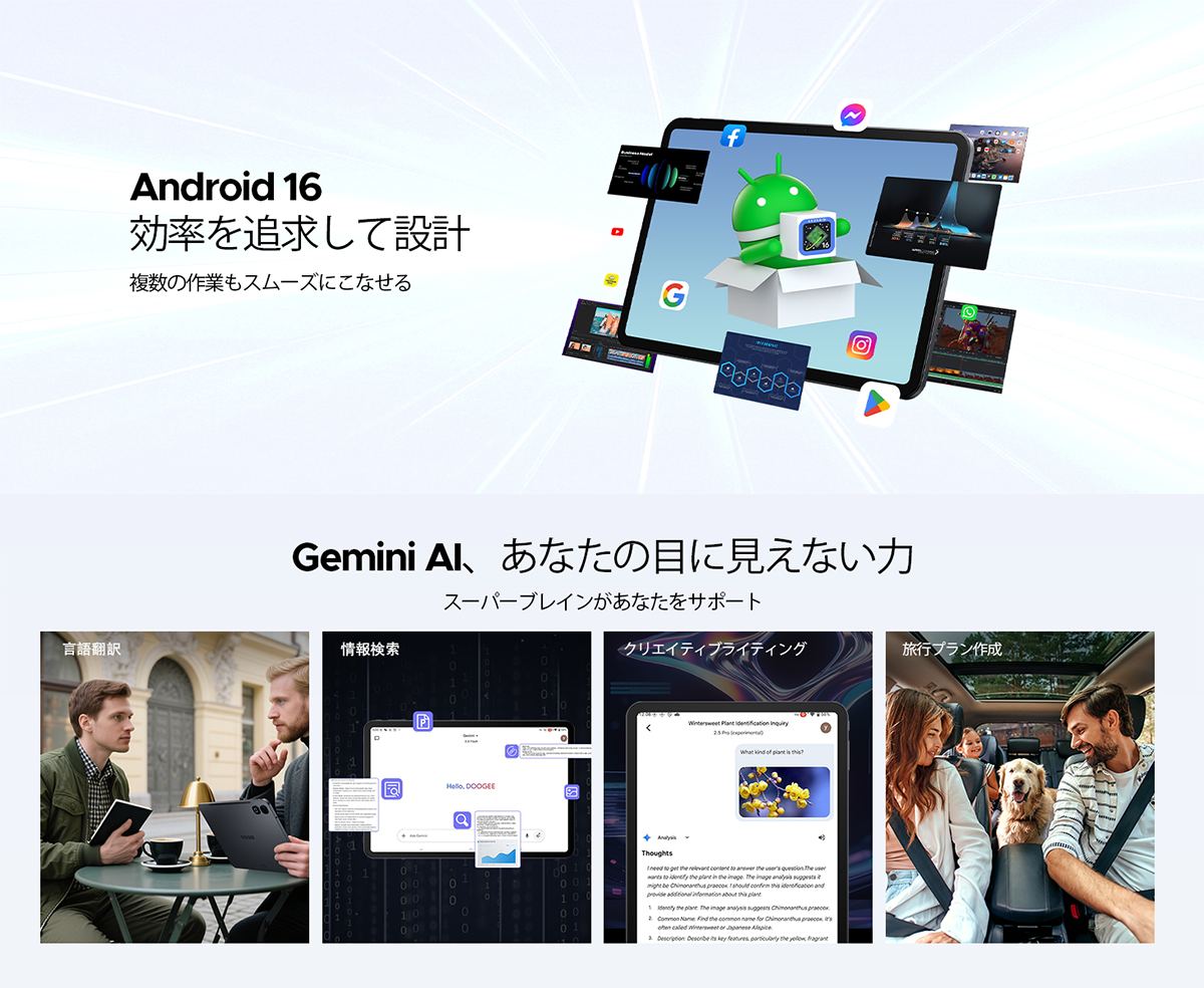「DOOGEE TAB G6MAX」は、最新のAndroid 16システムを採用し、Gemini AIによる学習型処理を実現。AIがアプリ動作や電力管理、音声認識を自動最適化し、従来モデルと比べて動作の安定性と応答速度が大幅に向上しました。