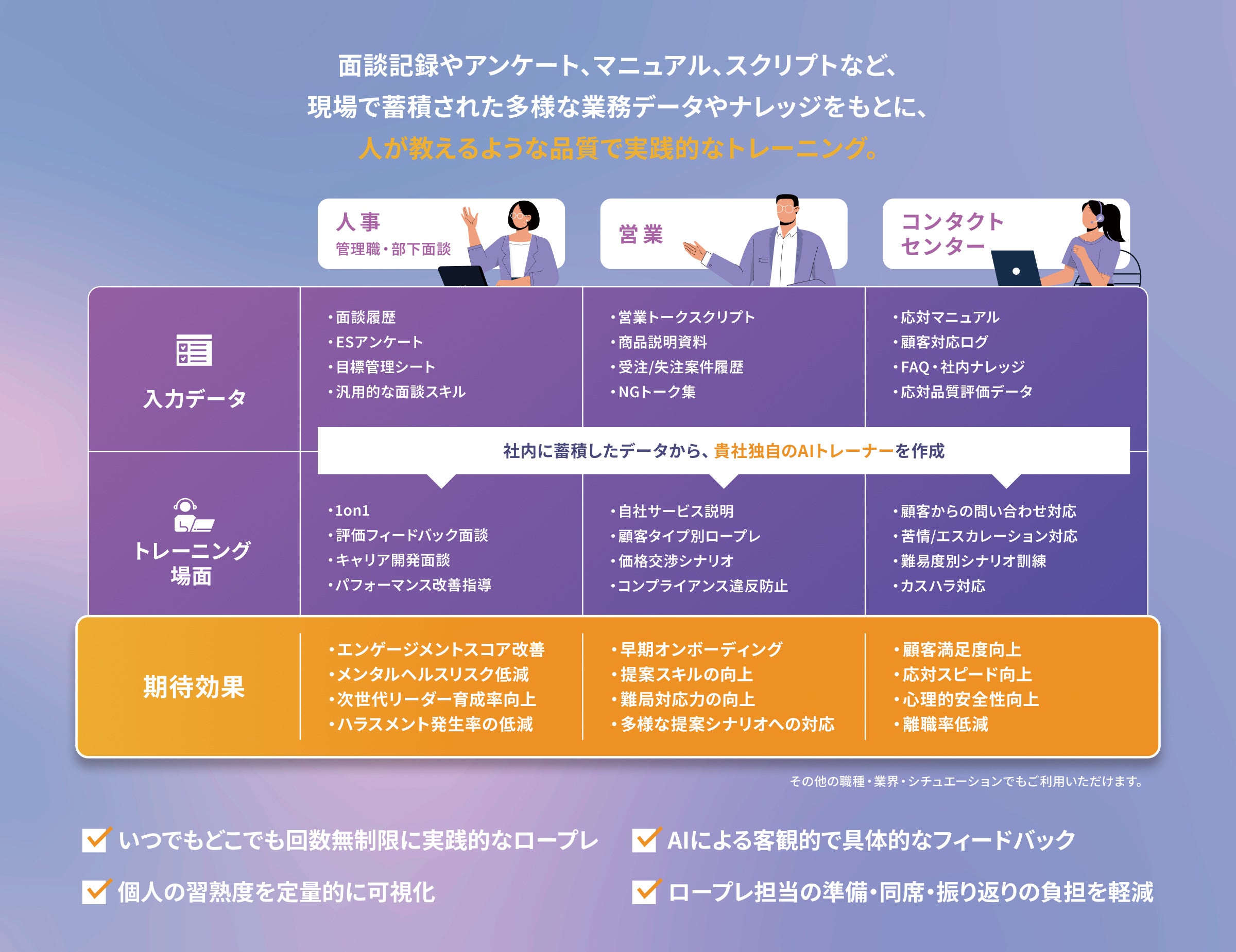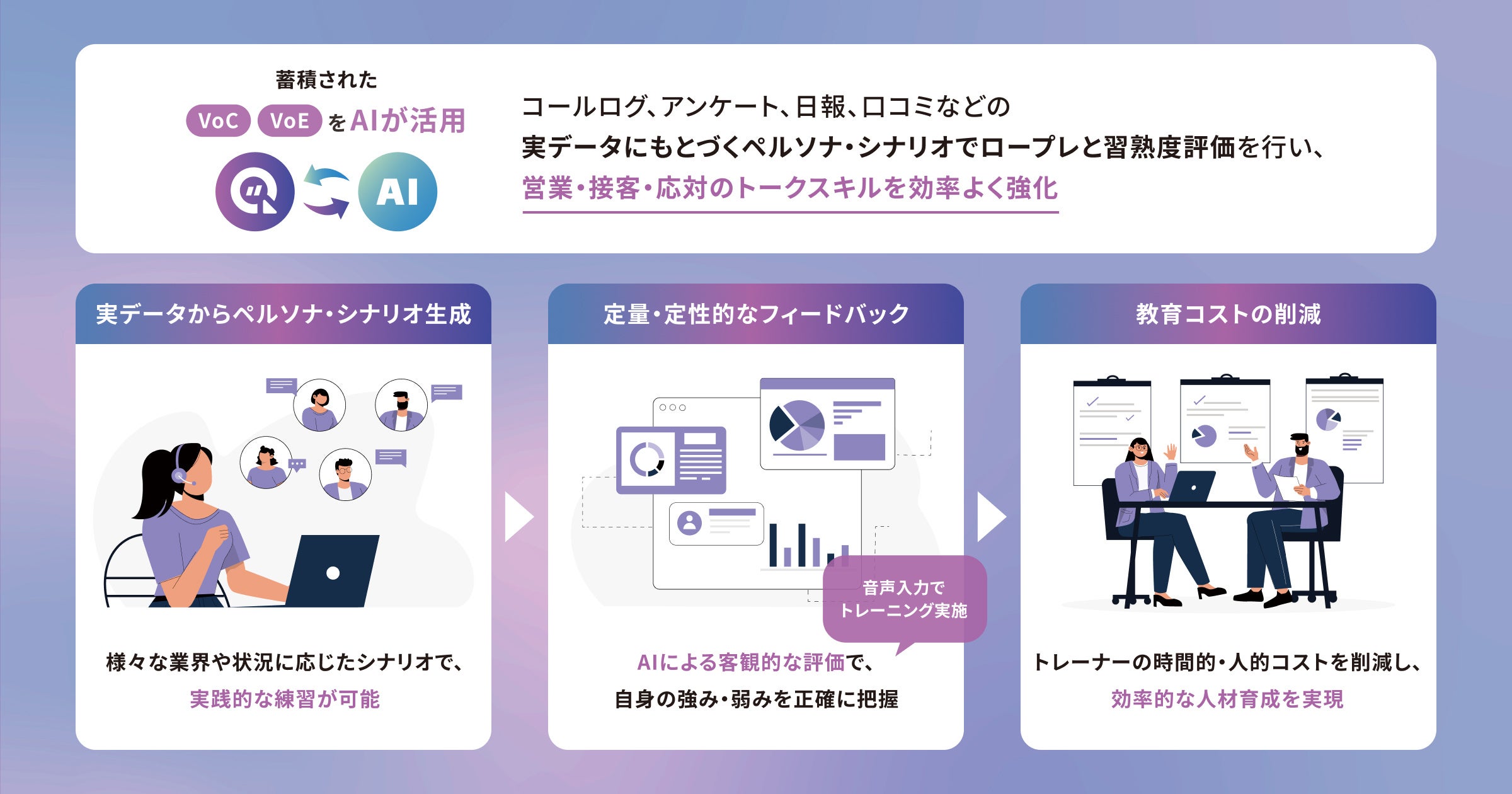 近年、ビジネスの成果を左右する 「対話力」 は、コールセンターでのカスタマーハラスメント(カスハラ)対応、営業担当者の商談力向上、人事担当者の面接スキル強化など、多様な場面でその重要性が増しています。しかし、実際の現場では試行錯誤を重ねながらスキルを磨くための機会は限られており、効率的かつ実践的な人材育成が喫緊の課題となっています。