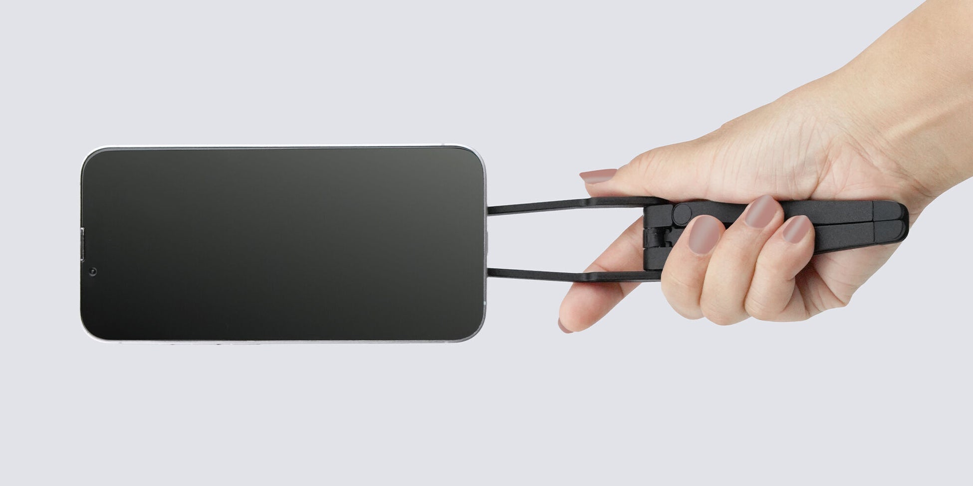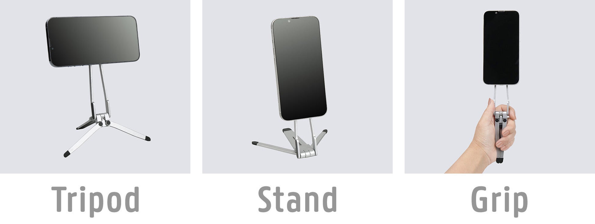 三脚(Tripod):安定した状態で動画撮影やビデオ通話などが可能。 スタンド(Stand):ハンズフリーで動画視聴やオンライン会議に最適。 グリップ(Grip):片手での安定した操作をサポートし、落下防止用のグリップとしても。