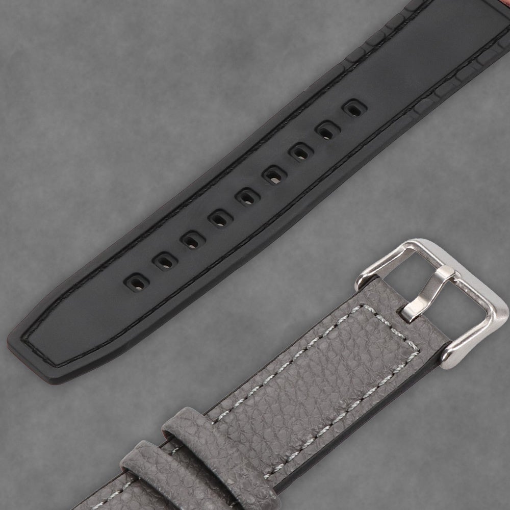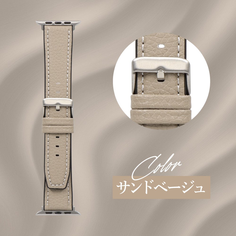 表地にカジュアルからフォーマルまで幅広くコーディネートできるシュリンクレザーを用い、裏地にシリコンラバーを配して、レザーバンドの上品さとシリコンバンドの機能性を掛け合わせたハイブリッド構造のApple Watchバンドです。