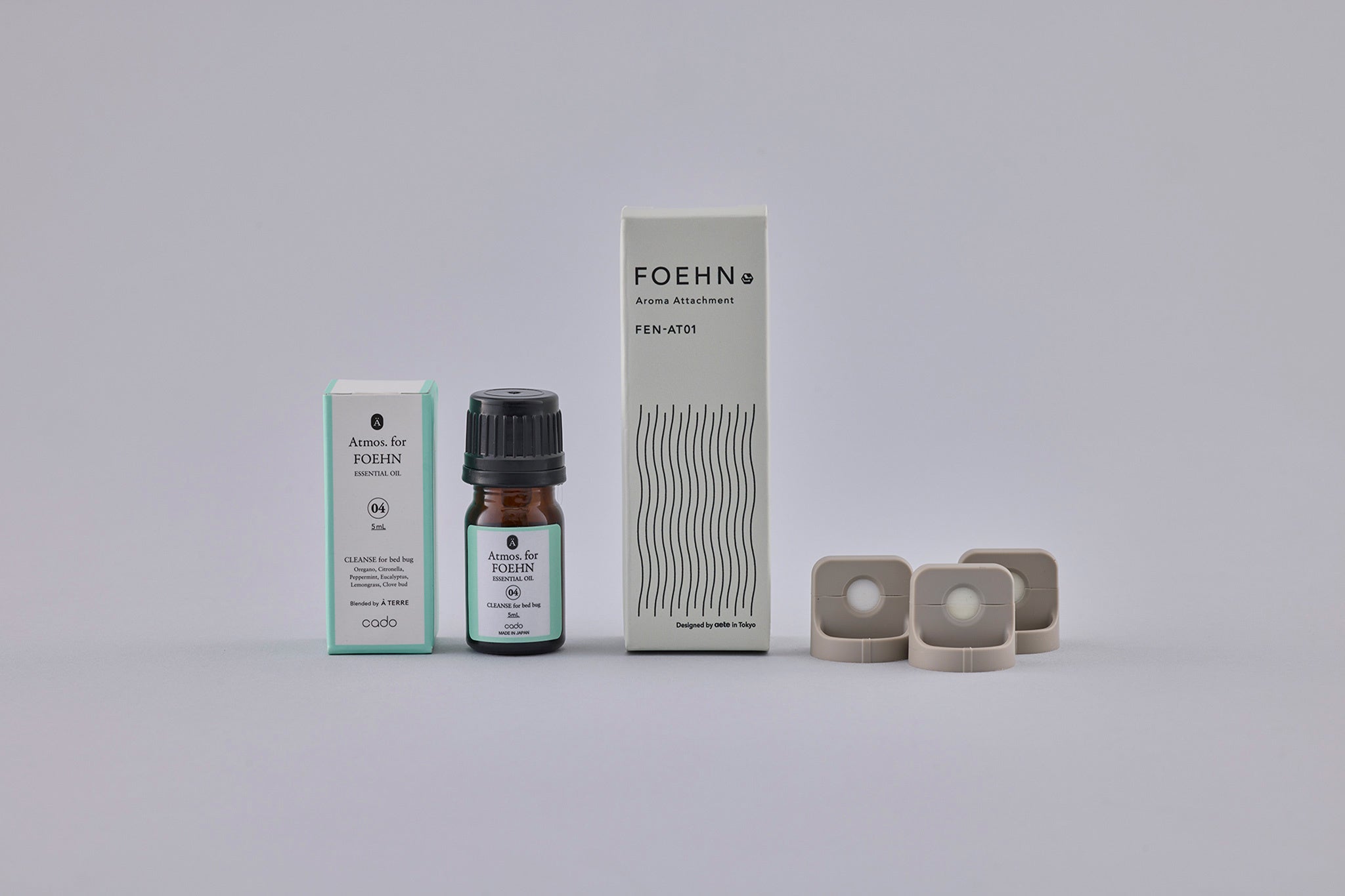 お好みの市販のアロマで楽しめるほか、安眠効果とトコジラミ対策を両立した専用の「エッセンシャルオイル Atmos. for FOEHN」もご用意しました。