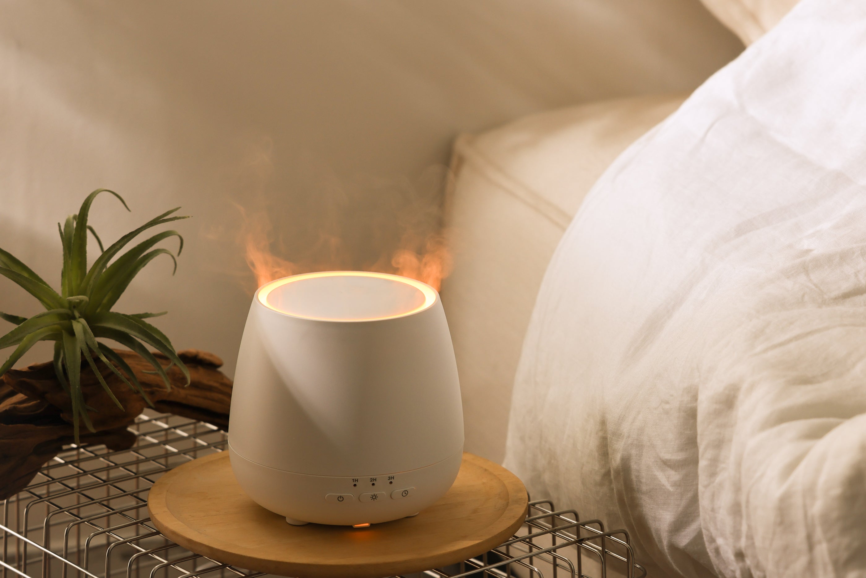 吹出口から炎のように広がる光と、すっきりとした本体デザインが特徴のアロマディフューザー。加えて本体幅は約8cmと超コンパクト、限られたスペースでもしっかりと乾燥を対策してくれます。