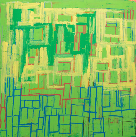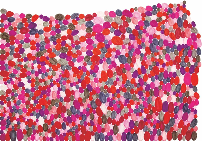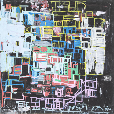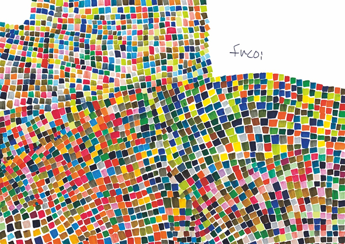 学校に行けず暇を持て余していた時期に、作家の母が「マルを描いて」と紙とペンを渡したのが創作のはじまり。マルというモチーフが彼女のなかでピタリとはまり熱中するようになる。マルを描き始めて5年になるが、近年はマル以外のモチーフも描くようになり、マル、サンカク、シカクのモチーフを大きなカンバスに日々飽きることなく描き続ける。コミュニケーションとして発する言葉はわずかだが、頭に浮かんだであろう言葉を繰り返し呟き、言葉と一緒に作品が生まれることもある。
