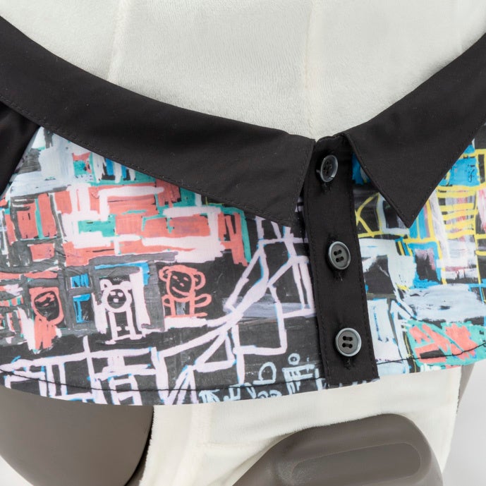 黒地に迷路をモチーフにしたアートが描かれた、着映えするシャツです。複雑な線と鮮やかな色の組み合わせが目を引くデザイン。襟や前立てを黒で統一することで全体を引き締め、華やかさと上品さを兼ね備えた特別な一枚に仕上がりました。