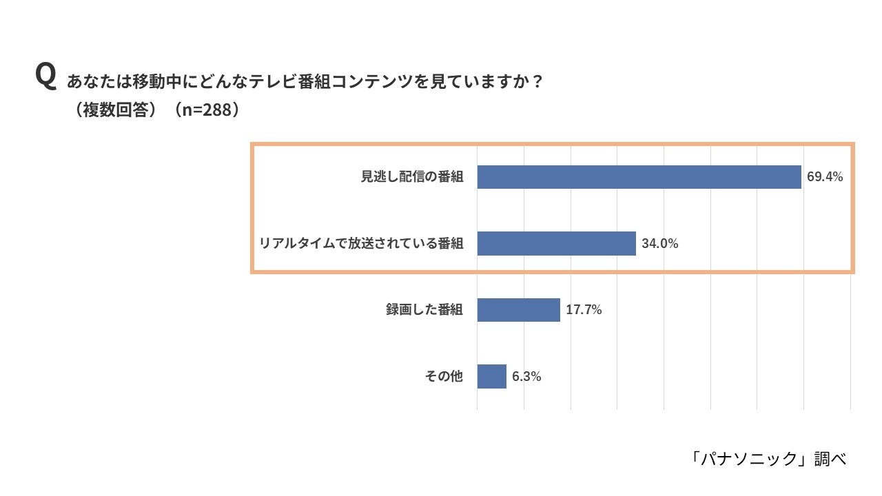 移動中(通勤・通学・外出先など)にテレビ番組コンテンツを視聴することがあるかを聞いたところ、全体では「よくある」と「たまにある」を合わせて36.1%となりました。さらに年代別にみると、10代が43.0%、20代46.0%となり、Z世代の半数近くの人がテレビ番組は移動中に視聴する傾向にあることが分かりました。また、移動中に見るテレビ番組コンテンツは何かを聞いたところ、「見逃し配信の番組」が69.4%となり、「リアルタイムで放送されている番組」を視聴する人も34.0%と一定数いることが分かりました。